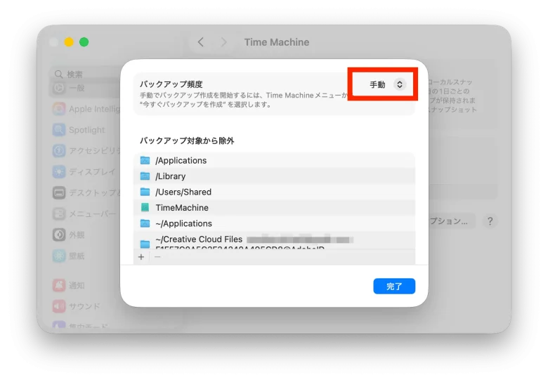 「バックアップ頻度」を必ず「手動」に設定してください。